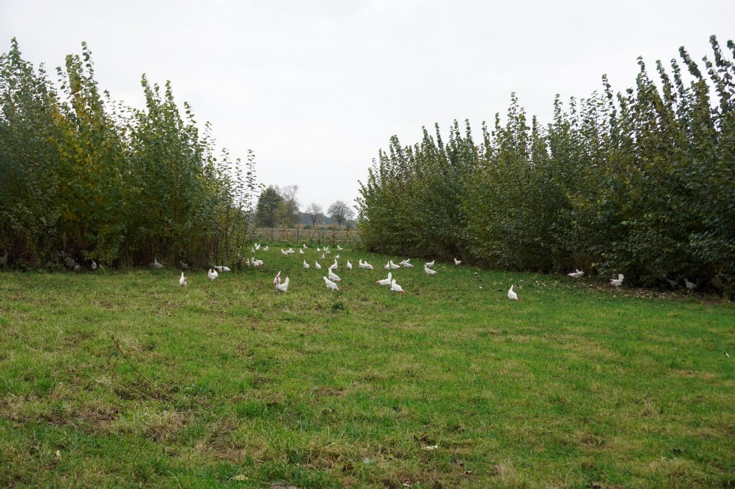 Außerdem ist zum Auslauf von Familie Engling zu sagen, dass jedem Huhn im Auslauf 5 m² statt der im Biobereich vorgeschriebenen 4 m2 zur Verfügung stehen. Somit hat der Betrieb noch etwas Puffer, sollten bestimmte Bereiche des Auslaufs kurzzeitig abgesperrt werden müssen. Durch dieses zusätzliche Platzangebot hat die längste Baumreihe eine Länge von ca. 190 m bis in die Ecken des Auslaufs hinein. Auch in diesem weiten Abstand zum Stall sind noch Hühner zu finden.