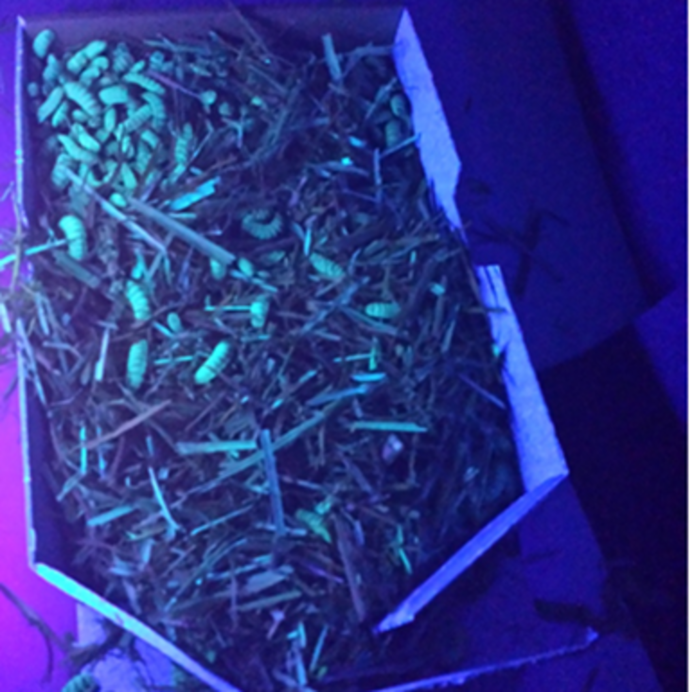 Der UV-A Anteil im Licht hilft dem Geflügel außerdem Feuchtigkeit besser zu erkennen. Somit scheinen z.B. Würmer im Stroh viel deutlicher hervor, als für uns Menschen (siehe Abbildungen).