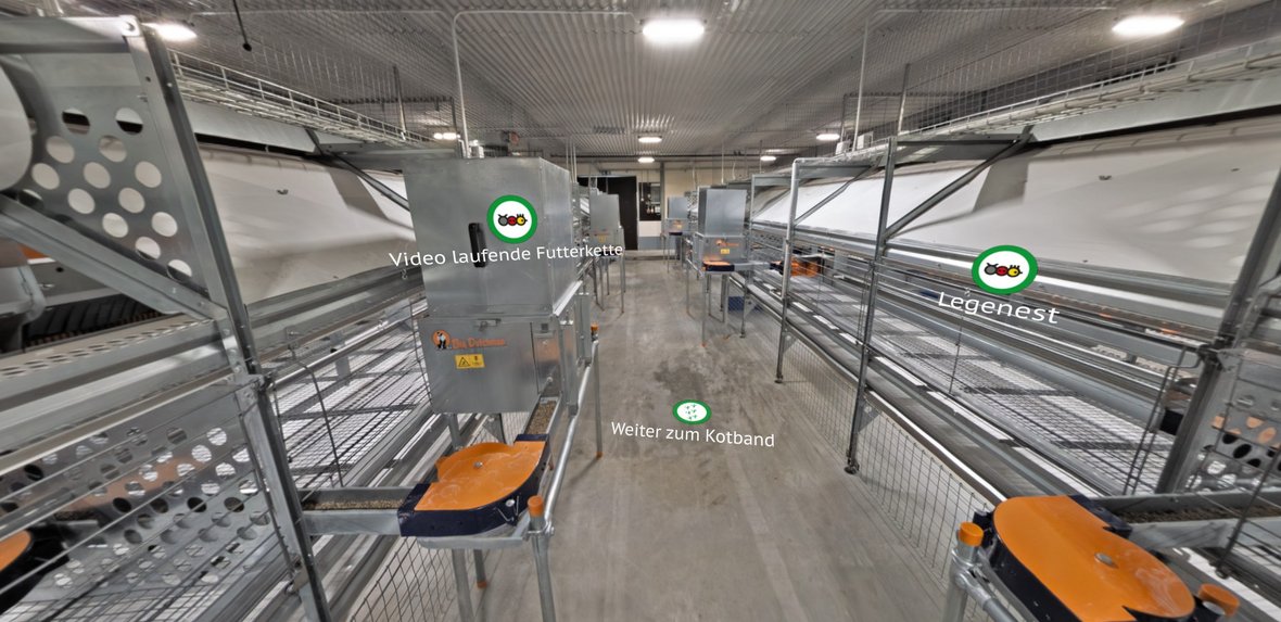 Der Legehennenstall auf dem VBZL Haus Düsse ist untergliedert in vier Abteile. Eines davon wurde im Jahr 2025 vollständig modernisiert. Dieses Demonstrationsabteil wurde mit einem in der Praxis gängigem Bodenhaltungssystem ausgestattet. Interessierte können sich in einem virtuellen Stallrundgang über die wichtigsten Elemente dieses Bodenhaltungssystems informieren.