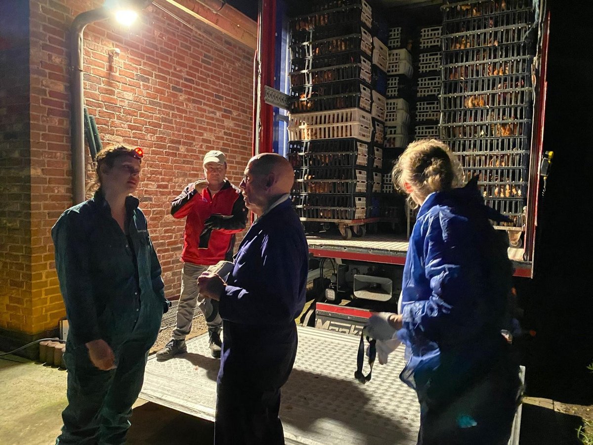 Fangen der Tiere mit Kaltscharraum und Überkopftransport zum LKW