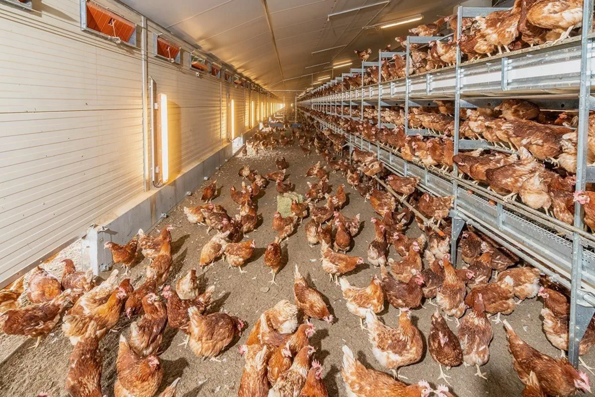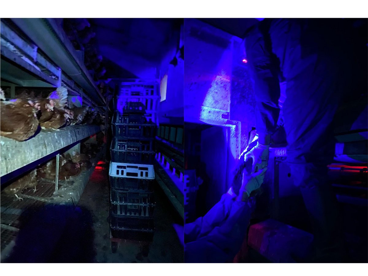 Legehennen werden meist in Volieren gehalten, was durch das Angebot erhöhter Ebenen für das Ausleben natürlicher Verhaltensweisen und damit das Tierwohl von Vorteil ist (Abb. 2). Beim Ausstallen stellt dieses Haltungssystem jedoch eine Herausforderung durch die perforierten Ebenen im Stall und durch den begrenzten Platz zur freien Bewegung für Menschen dar. Das Fangen, die Verladung und der Transport gehen für die Tiere mit Stress und körperlicher Belastung einher16. Um den Tieren möglichst wenig zusätzlichen Stress zu bereiten, findet die sogenannte „Ausstallung“ idealerweise nachts, wenn sich die Hennen im Haltungssystem des Stalls aufhalten, oder zumindest in einem abgedunkelten Stall statt. Die Fänger:innen tragen Stirnlampen mit Blaulicht, um die Tiere möglichst wenig zu stören und gleichzeitig trotzdem etwas sehen zu können.