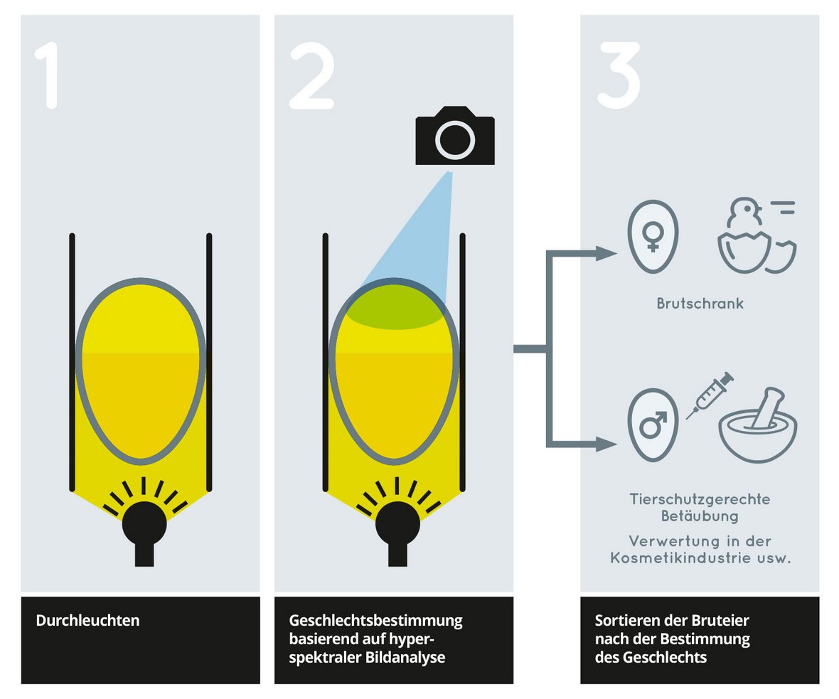 Per Wärmebildkamera wird am 4. Bruttag die Luftkammer im Ei lokalisiert und per Laser ein ca. 15 mm großes Loch in die Eischale geschnitten, ohne hierbei die Eimembran zu beschädigen. Anschließend wird mittels eines speziellen Verfahrens, das als Raman Spektroskopie bezeichnet wird, ein Blutgefäß mit ausreichendem Durchmesser durchleuchtet. Die Streuung bestimmter Lichtstrahlen ist spezifisch für männliche und weibliche Tiere und kann somit Auskunft auf das Geschlecht des Embryos im Ei geben. Zum Abschluss wird die Öffnung in der Eischale mittels eines biokompatiblen Klebebandes wieder verschlossen. In Forschungsarbeiten wurde eine Zuverlässigkeit von 90-93% und eine Schlupfrate von 81-96% festgestellt. Für diese Technik konnte noch kein Termin zur Markteinführung benannt werden12,13.