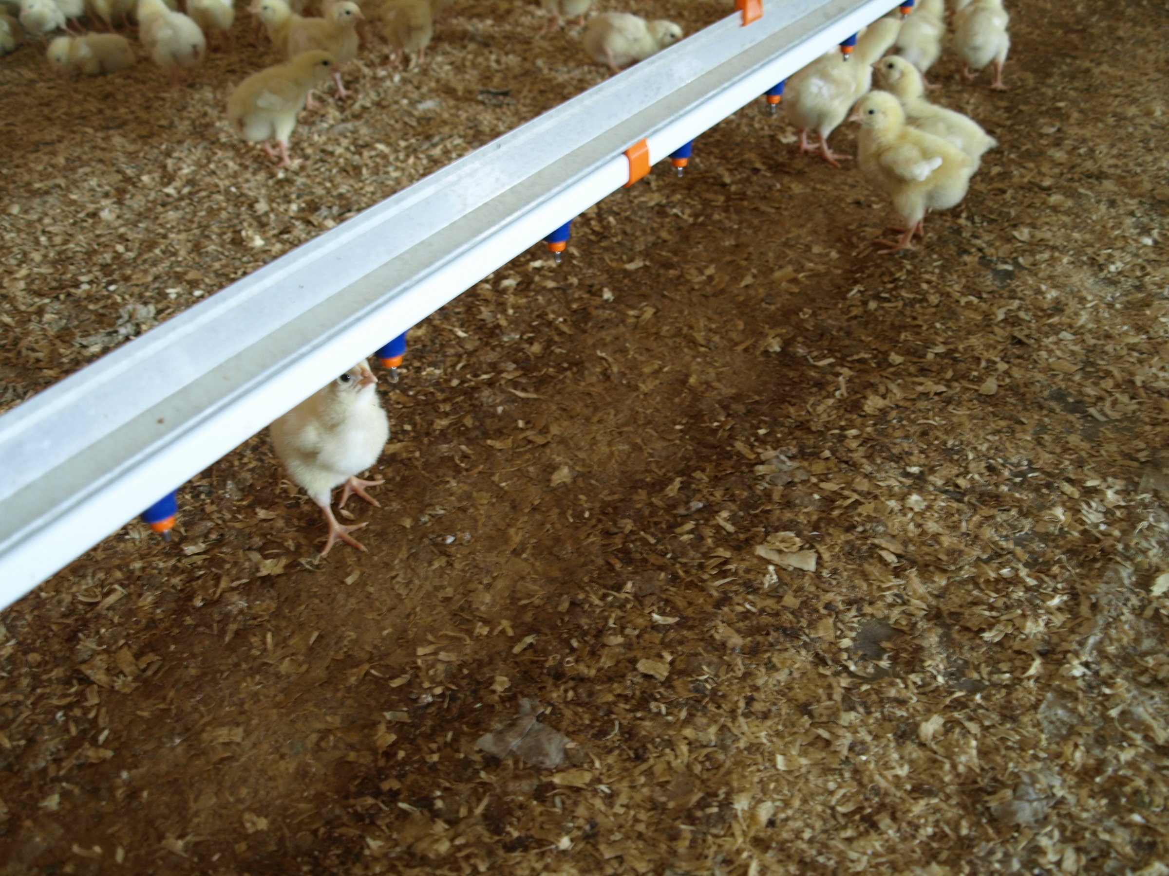Ebenso müssen die Tränkelinien regelmäßig auf defekte, leckende Nippel kontrolliert werden. Tropfende Nippel müssen ausgetauscht werden. Haben sich bereits nasse Stellen unter den defekten Tränkenippeln gebildet, sollten diese entfernt und neu eingestreut werden.