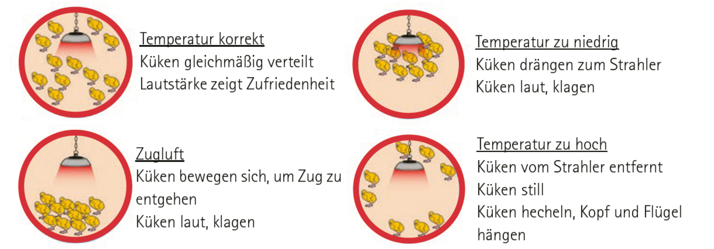 Im Krankheitsfall ist die Erhöhung der Einstreuintensität daher ein sehr wirkungsvoller Ansatz, um sowohl den Keimdruck zu reduzieren, als auch dem Auskühlen der Tiere entgegenzuwirken. Es sollte sowohl die Einstreufrequenz als auch die Menge des Einstreumaterials angepasst werden.