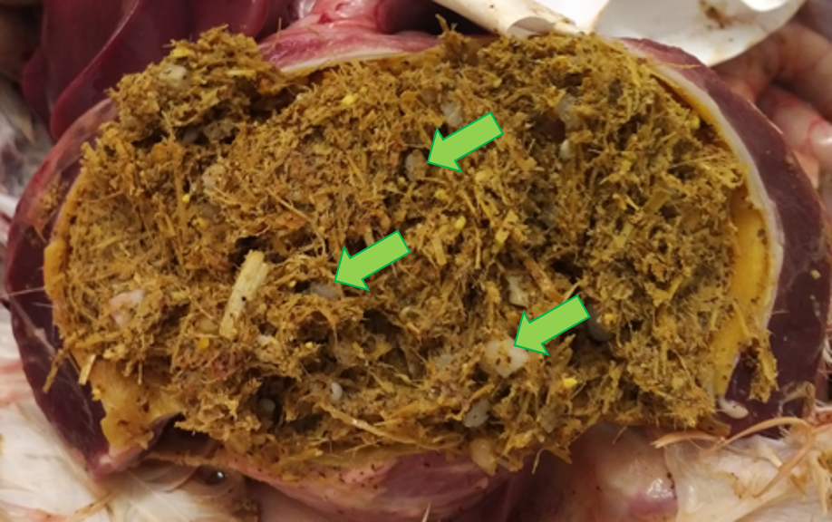 Das Tier hat so viel Einstreu aufgenommen, dass die im Muskelmagen befindlichen Gritsteinchen (Pfeile) nicht ausreichten, um den Mageninhalt ausreichend zu zerkleinern. (© Moorgut Kartzfehn)