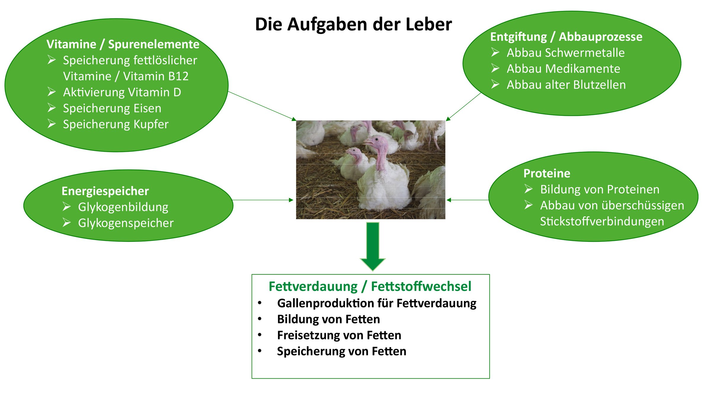 Die Leber ist ein Organ, das bei Säugetieren und Vögeln an einer Vielzahl von Stoffwechselprozessen beteiligt ist (Abb.1). Im Vergleich zu Säugetieren erfolgt die Fettsynthese beim Vogel jedoch zu einem Großteil in der Leber und nur zu einem relativ geringen Anteil im Fettgewebe. Dies ist begründet in anatomischen Unterschieden zwischen Säugetieren und Vögeln und begünstigt beim Vogel, und somit auch bei der Pute, die Fettanreicherung in der Leber.1