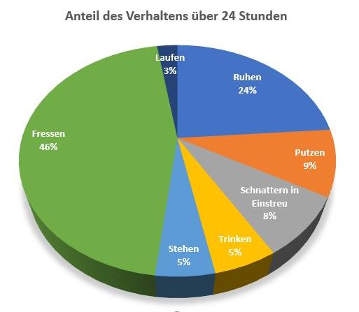 Abb. 2 zeigt die Verteilung des Verhaltens der Tiere über den Tag. Das Ruhen und Putzen nehmen die meiste Zeit in Anspruch. Die Tiere sind auch nachts aktiv, die Hauptaktivitätszeiten liegen jedoch in der Morgen- und Abenddämmerung. Die Pekingente unterscheidet sich damit im Verhalten grundsätzlich vom Huhn.