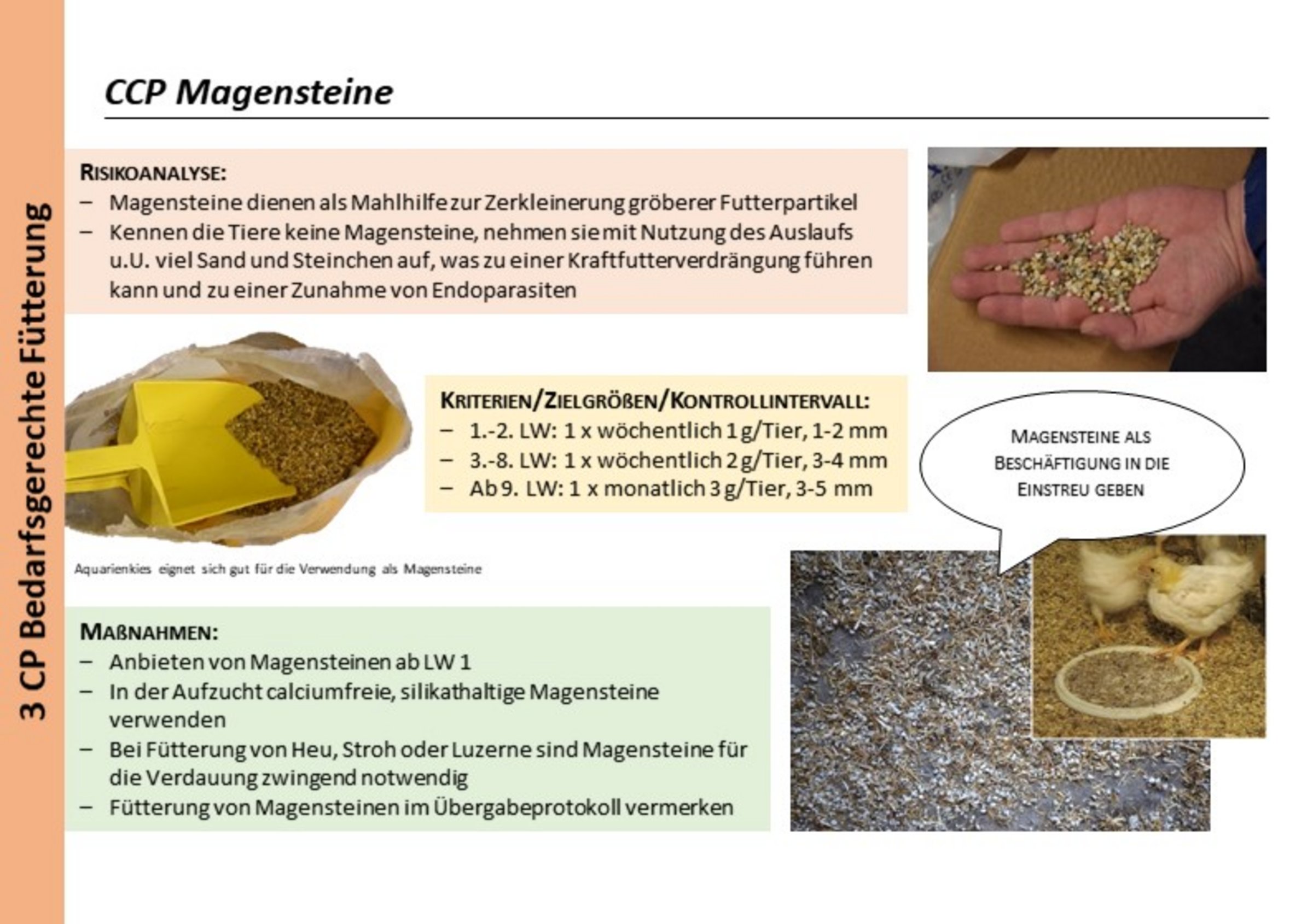 Das in der Lebensmittelproduktion verwendete HACCP-Konzept (englisch für Hazard Analysis and Critical Control Points - übersetzt: Gefahrenanalyse und kritische Kontrollpunkte) basiert auf der Vermeidung von Gefahren durch die Ermittlung und Beherrschung von Kritischen Kontrollpunkten. Die Lebensmittelsicherheit soll damit zu jedem Zeitpunkt gewährleistet werden. Dazu werden zunächst relevante Kontrollpunkte (englisch: Control Points) im Prozess erfasst und schließlich die Kritischen Kontrollpunkte (englisch: Critical Control Points) identifiziert. Entsprechende Maßnahmen zur Beseitigung oder Minimierung des Risikos werden definiert und dienen der Beherrschung von Gefahren. Dieses Konzept lässt sich auch auf die Tierhaltung übertragen und wurde im Projekt erfolgreich umgesetzt. Das Ziel ist es, Tierhalter:innen und/oder bestandsbetreuende Personen dahingehend zu sensibilisieren, dass kritische Aspekte im Leben einer Junghenne bzw. Legehenne erkannt werden und entsprechende Maßnahmen ergriffen werden, um dem Auftreten von Federpicken und Kannibalismus entgegenzuwirken.