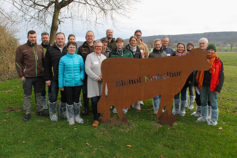 Das Netzwerktreffen der Impulsbetriebe Rind fand auf dem Impulsbetrieb Biohof Kinkelbur statt, welcher seit 1648 in Familienbesitz ist. An wohlgedeckten Tischen lernten sich die neuen und alten Betriebe bei Kaffee und Kuchen kennen. Nach einer Vorstellungsrunde präsentierte Prof. Volker Krömker den zehn Betrieben die sechs wichtigsten Eutergesundheitskennzahlen, zu denen beispielsweise der Anteil eutergesunder Tiere in der Herde oder auch die Heilungsrate in der Trockenperiode gehört. Anschließend gab es für die Betriebe die Möglichkeit individuelle, betriebsspezifische Fragen zu stellen, um Lösungen und Anreize für die Verbesserung der betriebseigenen Eutergesundheit zu erhalten. Es fand eine tiefgehende Diskussion zu praktischen Aspekten der Hygiene in Zusammenhang mit der Euter- aber auch der Kälbergesundheit statt. Bei der anschließenden Betriebsführung, inklusive Besuch im Melkstand und Hofladen, wurde der Austausch weiter vertieft.