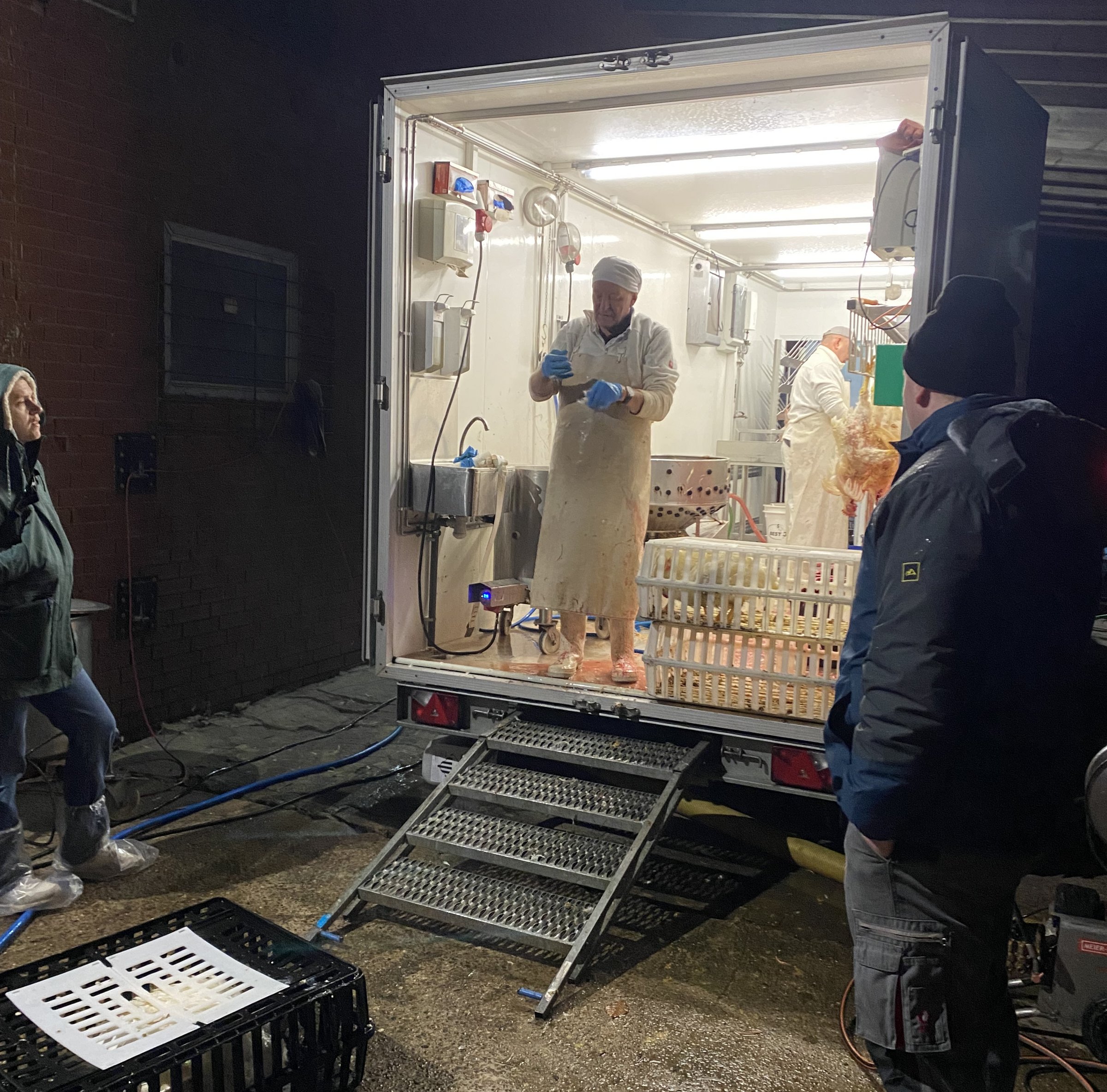 Der zweite Tag des Netzwerkstreffens startete noch in der Dunkelheit des frühen Morgens, da die Gruppe zu Iris Flentje zur Besichtigung der mobilen Geflügelschlachtung eingeladen war. Neben der Schlachtung konnten sich die Betriebsleiter:innen noch ein Bild der mobilen Haltung von Masthähnchen in selbst konzipierten Mobilställen machen. Der kollegiale Austausch wurde auch hier wieder intensiv genutzt. Als Abschluss und für ein verspätetes Frühstück traf sich die Gruppe nochmal im Hotel. Es wurde nochmal intensiv diskutiert und auch die nächsten Netzwerktreffen, wie auch die Exkursion wurden thematisiert, da die Gruppe weiterhin mit viel Motivation und Engagement im Austausch bleiben möchte.