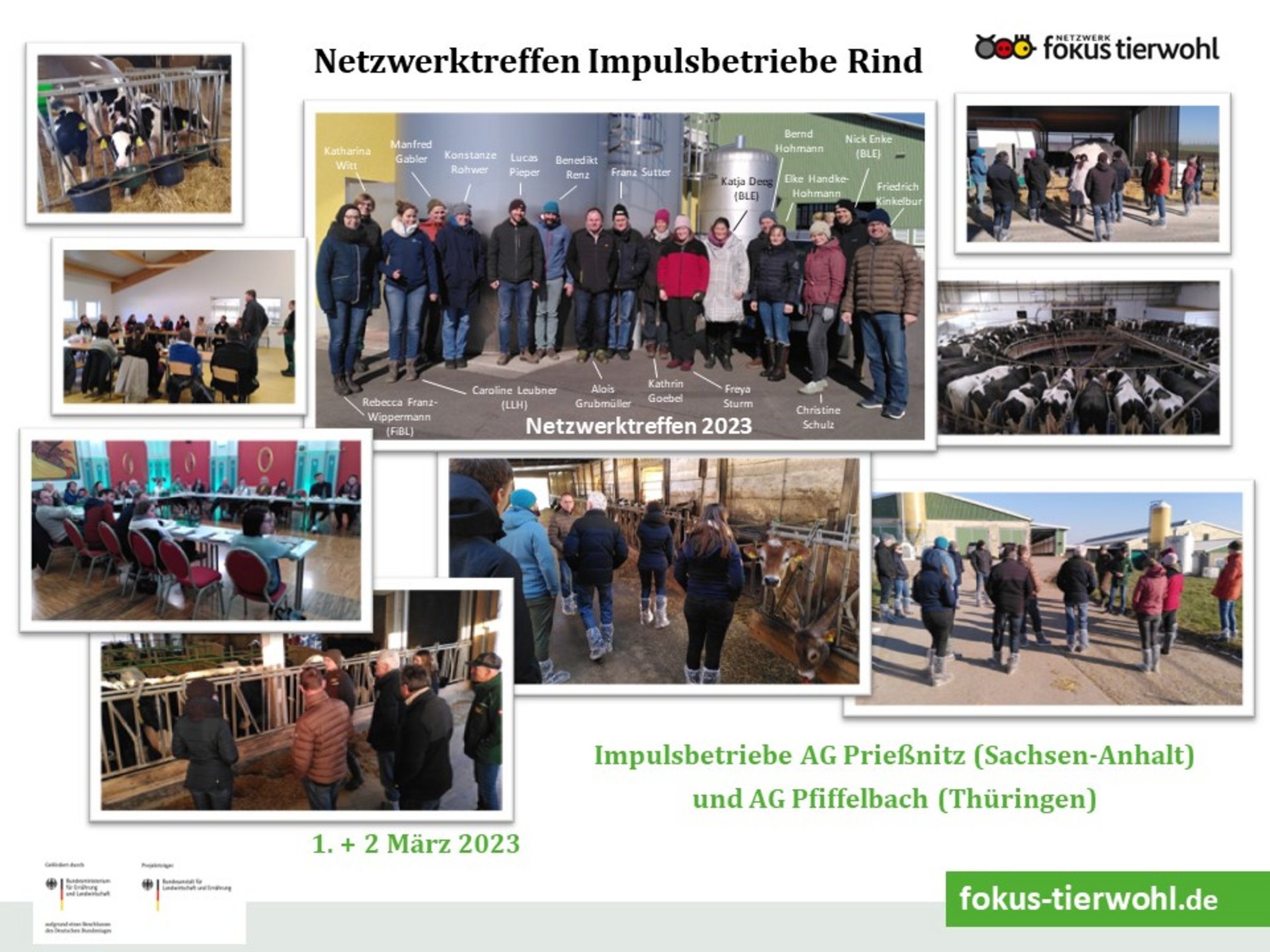 Nach dem erfolgreichen ersten Netzwerktreffen der Impulsbetriebe Rind in Präsenz brachen diesmal, trotz krankheitsbedingter Absagen, zwölf Betriebe nach Naumburg auf. Am 1. und 2. März fand dort das zweite Treffen der Impulsbetriebe Rind statt, um sich fachlich auszutauschen und zwei Betriebe in Sachsen-Anhalt und Thüringen zu besuchen. Begleitet wurde das Treffen von Herrn Enke und Frau Deeg von der Bundesanstalt für Landwirtschaft und Ernährung, die als Projektträger fungiert. Zu Beginn des Treffens stand eine Vorstellungsrunde und die Besprechung von aktuellen Tierwohlthemen an, welche die Impulsbetriebe gerade bewegen. Die Haltung der Kälber war ein häufig genanntes Thema. Einerseits vor dem Hintergrund der Änderung in der Tierschutztransportverordnung (v.a. Bullenkälber von Milchrassen), andererseits mit Blick auf die Form der Milchversorgung (ad libitum, kuhgebundene Aufzucht, Tränkedauer, …) als auch auf eine möglichst frühe Einführung der Gruppenhaltung. Darüber hinaus spielten auch Nachhaltigkeitsthemen (Klimarelevanz von Kühen, Emissionsminderung, …) eine Rolle.