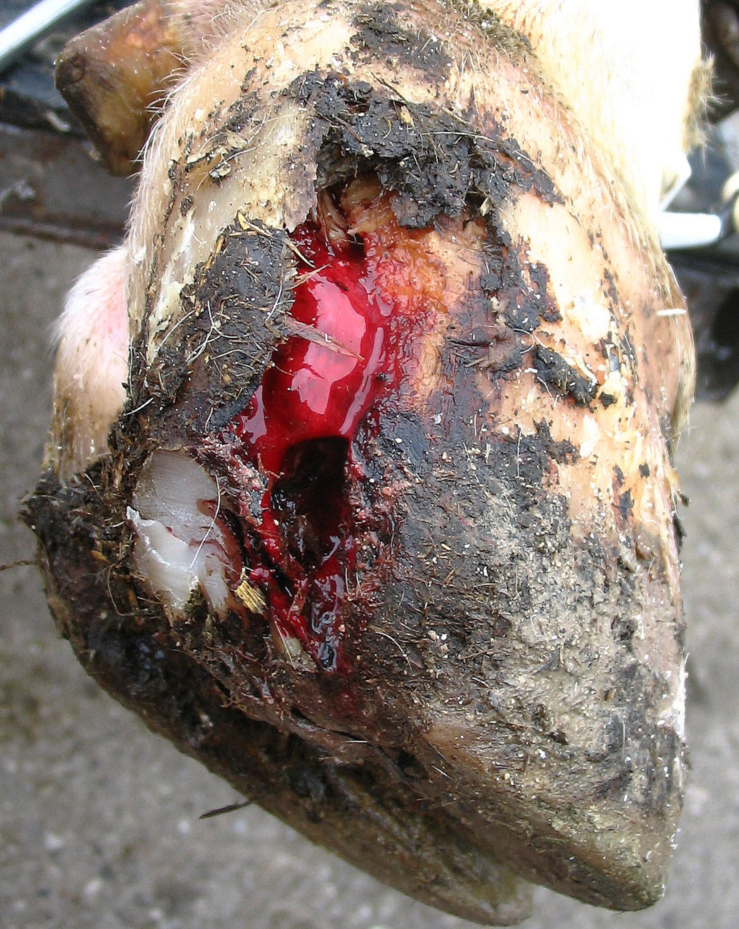 Eine Vorreinigung, Desinfektion und Trocknung der Läsion bzw. des umliegenden Gewebes sind dringend zu empfehlen. Zudem ist es ratsam, einen Klauenverband auch bei Defekten, die tieferliegende Strukturen betreffen, bis zur Vorstellung beim Tierarzt anzulegen. Dieser erfüllt lediglich eine Schutz- und Stützfunktion und stellt keine Therapie dar.