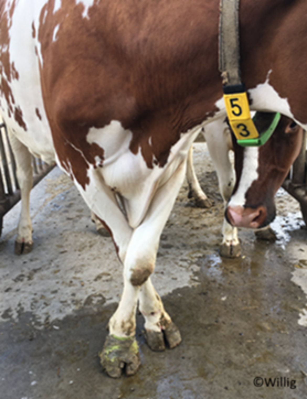 Mindestens alle 14 Tage sollte auf die Beinstellung, die Rückenlinie und auf Entlastungshaltungen geachtet werden (nachfolgend beschrieben). Es kann betriebsindividuell entschieden werden, wie die Überprüfung in den Betriebsablauf integriert werden soll. Der beste Blick hierfür ist, die Kühe zur Futtervorlage am Fressgitter von hinten und von der Seite zu betrachten (Abb. 3). Der Fokus wird so auf die Klauen und auf den Rücken gelegt. Beim konventionellen Melken kann auch im Melkstand auf die Beinstellung und auf Entlastungshaltungen geachtet werden. Eine gute Ausleuchtung ist dabei wichtig, die durch Taschenlampen oder Stirnlampen erreicht werden kann. Klauenerkrankungen, wie z. B. Dermatitis Digitalis (DD), die bei der Beurteilung beobachtet werden, sollten sofort dokumentiert und im Anschluss direkt behandelt werden.