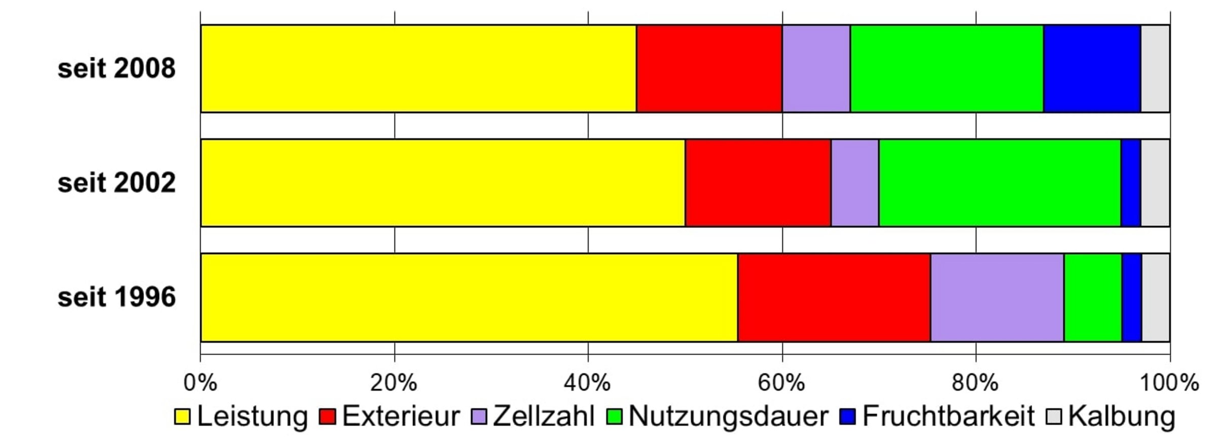 Schon seit April 1996 wurden das Exterieur (als Indikator für Klauen- und Eutergesundheit), die Zellzahl (für Eutergesundheit), die Nutzungsdauer, die Fruchtbarkeit und der Kalbeverlauf (für Leichtkalbigkeit) anteilig in den Gesamtzuchtwert integriert.