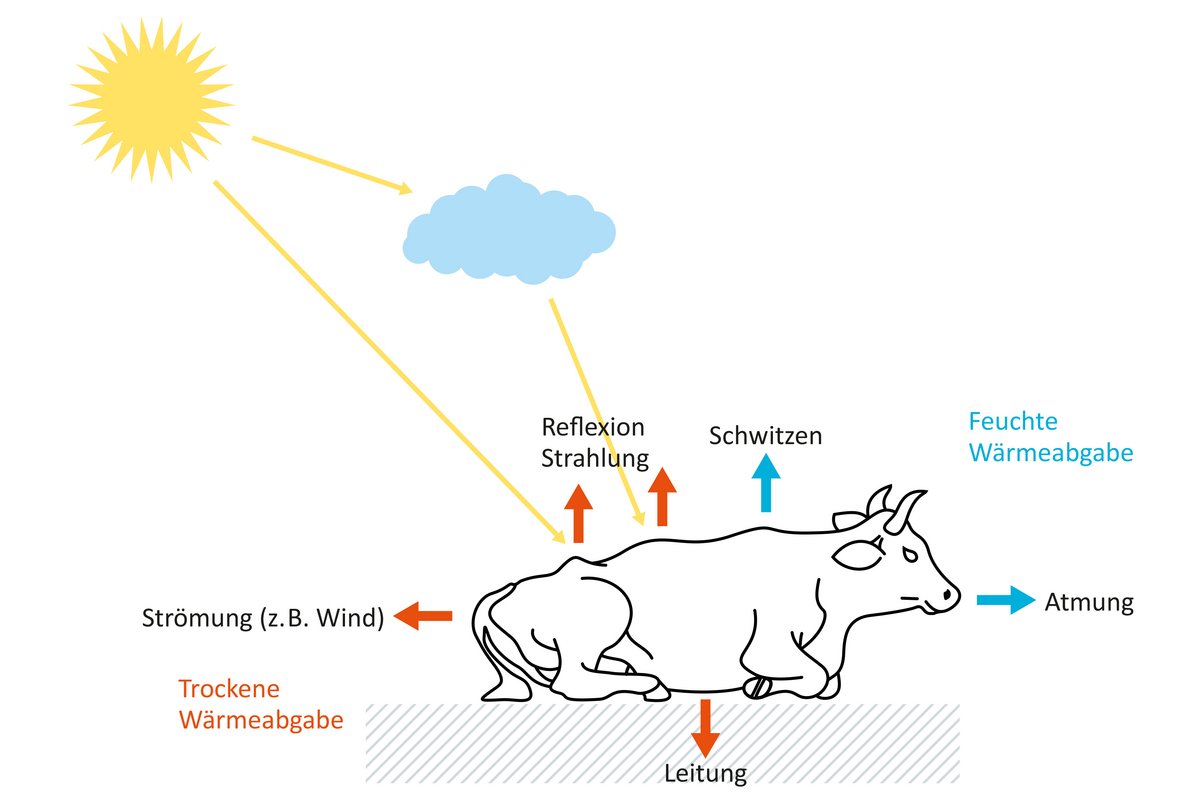 Bei Hitzebelastung regulieren die Milchkühe in der thermoneutralen Zone ihre Körpertemperatur durch Wärmeabgabe. Dazu stehen folgende Mechanismen zur Verfügung (Abb. 2):