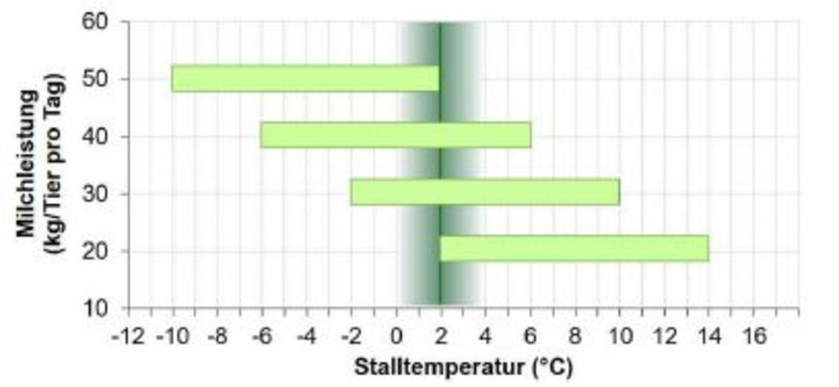 Wichtig zu nennen ist die Optimalzone und die Thermoneutrale Zone. Die Optimalzone ist die Temperaturspanne, in der weder Kälte noch Wärme empfunden wird. Milchkühe sind sehr kältetolerant, aber nicht stark wärmebelastbar. Die Wohlfühltemperatur der Kühe wurde früher in einem Temperaturbereich von 4 bis 16°C eingeordnet. Bei diesen damaligen Untersuchungen waren allerdings die Milchleistungen deutlich geringer (25 kg/Tag). Heute weiß man, dass die Optimalzone bei Kühen mit einer höheren Leistung (heute bis zu 50 kg/Tag und mehr) deutlich unter dieser Spanne liegt. Der optimale Temperaturbereich unterscheidet sich für jedes Individuum u.a. in Abhängigkeit der aktuellen Milchleistung. Je höher die Milchleistung ist, desto niedriger liegt der Optimalbereich, da durch höhere Stoffwechselaktivität das Tier selbst große Mengen an Wärme produziert und somit empfindlicher gegenüber hoher Umgebungstemperatur reagiert (siehe Abb. 1). Die Thermoneutrale Zone ist nach oben und unten weiter gefasst als die Optimalzone. Wenn diese Zone unter- oder überschritten wird (untere/obere kritische Temperatur), finden physiologische Anpassungsmechanismen statt, um die Körpertemperatur konstant zu halten.