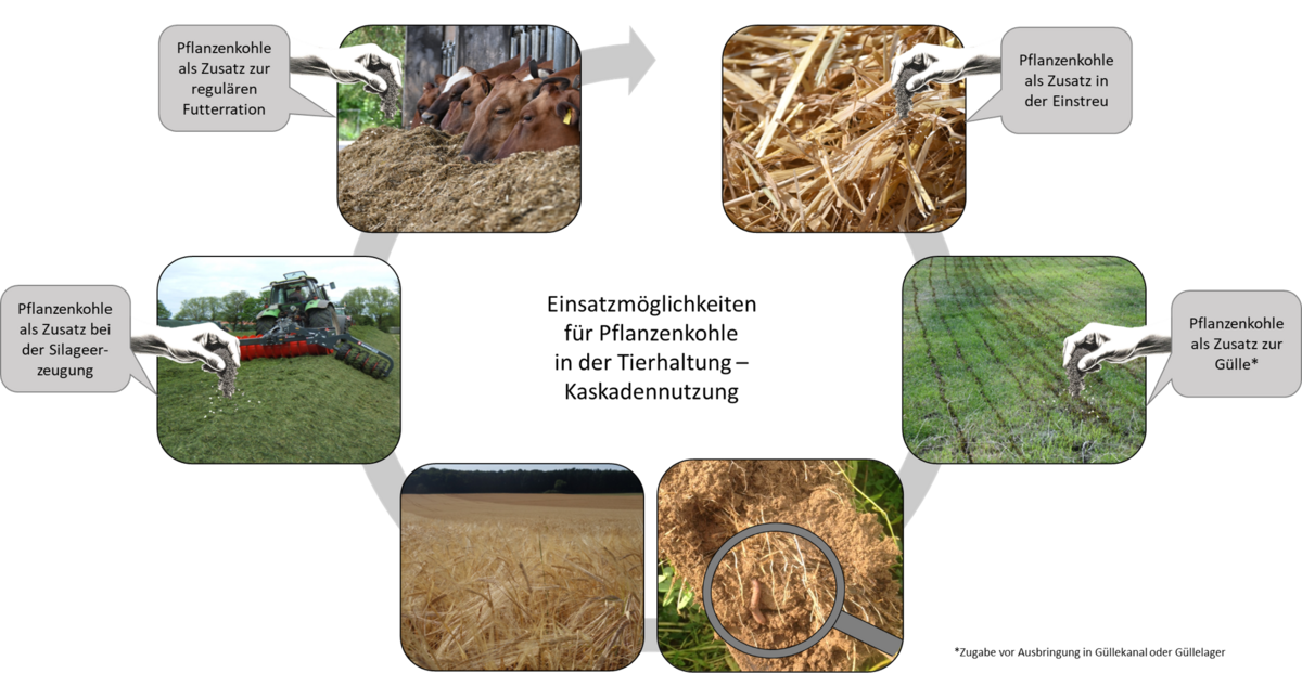 Der Startpunkt des Einsatzes kann dabei in der Fütterung, in der Silagebereitung, in der Stalleinstreu oder als Zugabe zur Gülle liegen. Über die weitere Verwendung der Ausscheidungen als organische Düngemittel (Gülle, Jauche, Stallmist) gelangt die mit Nährstoffen angereicherte Pflanzenkohle letztendlich auf die Fläche und kann dort als Bodenverbesserer wirken. Da es bislang keine nachgewiesenen Vorteile des Pflanzenkohleeinsatzes in der Fütterung gesunder erwachsender Rinder gibt, erscheinen die nachgelagerten Zugabemöglichkeiten für Pflanzenkohle geeigneter um die Kaskadennutzung zu beginnen.