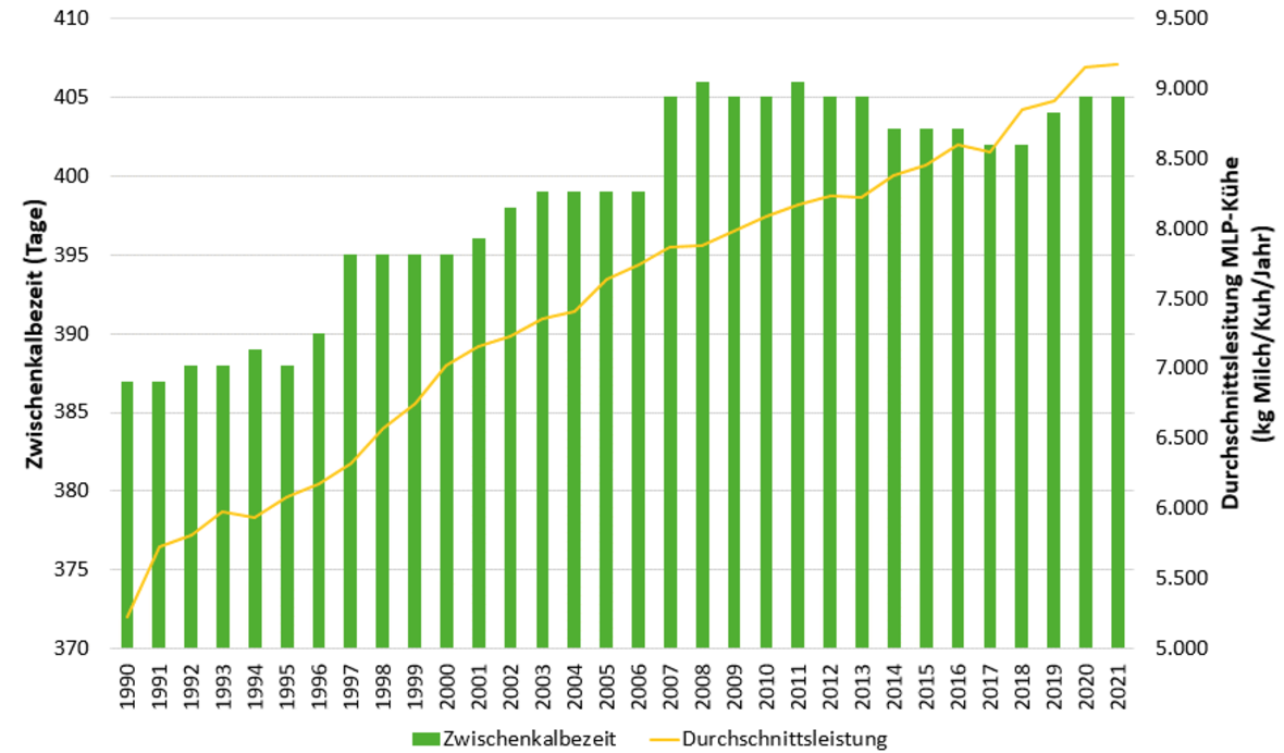 Mit steigender Milchleistung sollten diese Grenzen überdacht werden, denn je mehr Durchschnittleistung, desto mehr Tage sollten der Kuh als freiwillige Wartezeit zugestanden werden, um wirtschaftliche Vorteile zu nutzen und um die Tiergesundheit und das Tierwohl zu stärken. In Abbildung 2 ist der Zeitverlauf über die Jahre anhand der Zwischenkalbezeit und der Durchschnittleistung aufgezeigt.