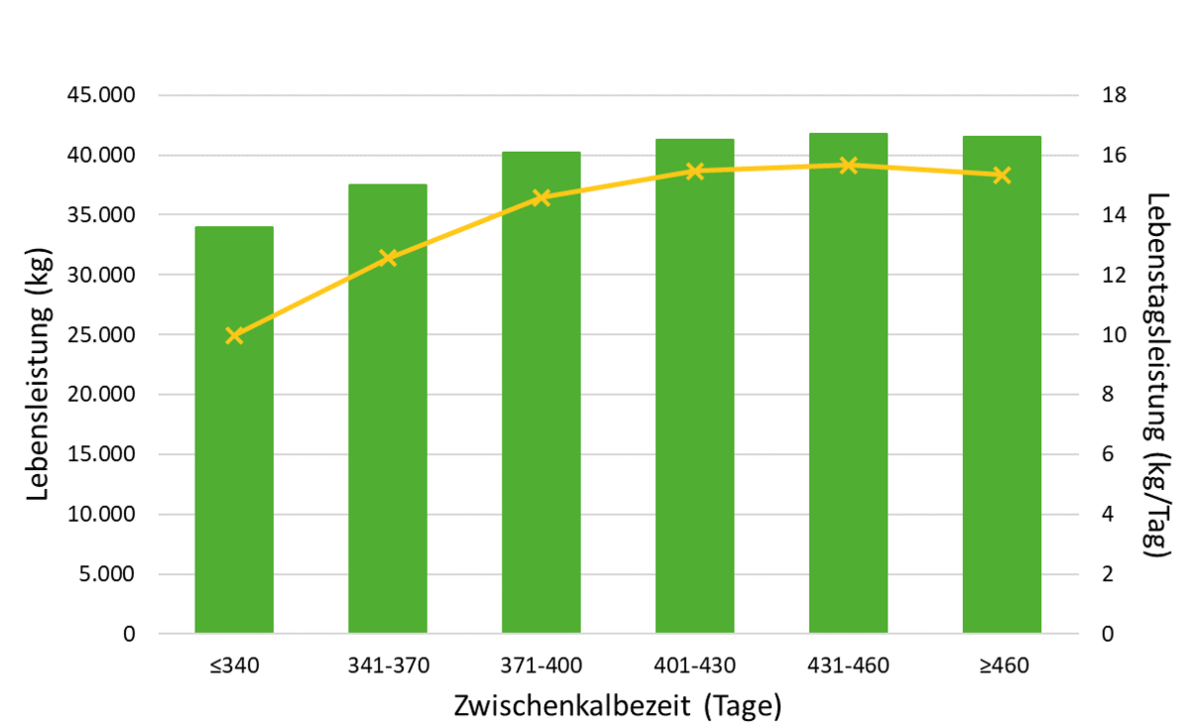 Die Lebensleistung sowie die Leistung je Lebenstag nehmen zu, wenn den Kühen eine längere Zwischenkalbezeit gewährt wird (Römer, 2016). Die höchsten Leistungen zeigten die Kühe mit einer Zwischenkalbezeit von 431 bis 460 Tagen (Abb. 4) im Vergleich zu Kühen mit kürzeren bzw. noch längeren ZKZ.