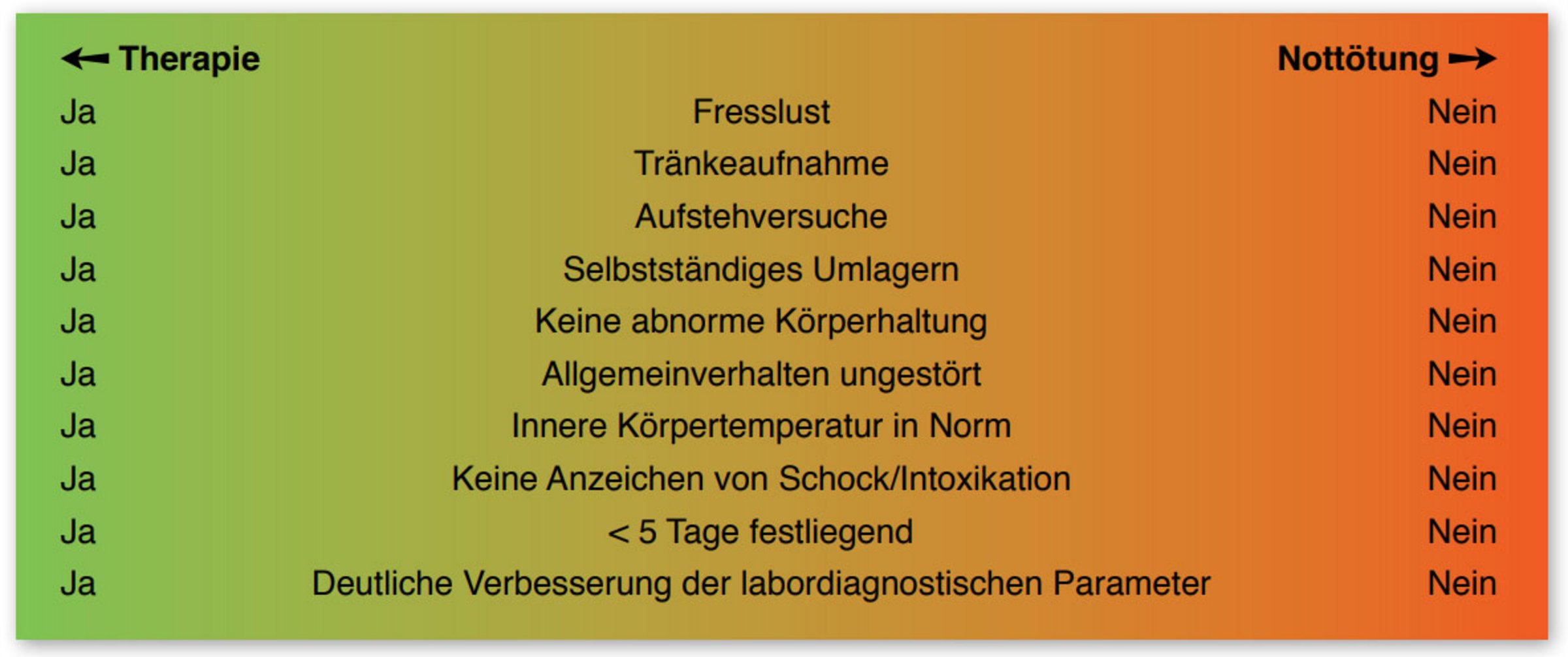 - bei Tieren mit frischen Verletzungen, die schwer zu heilen sind z. B. Knochenbruch, Ausgrätschen, akuter Gebärmuttervorfall, große stark blutende Wunden. Das Tier ist nicht transportfähig