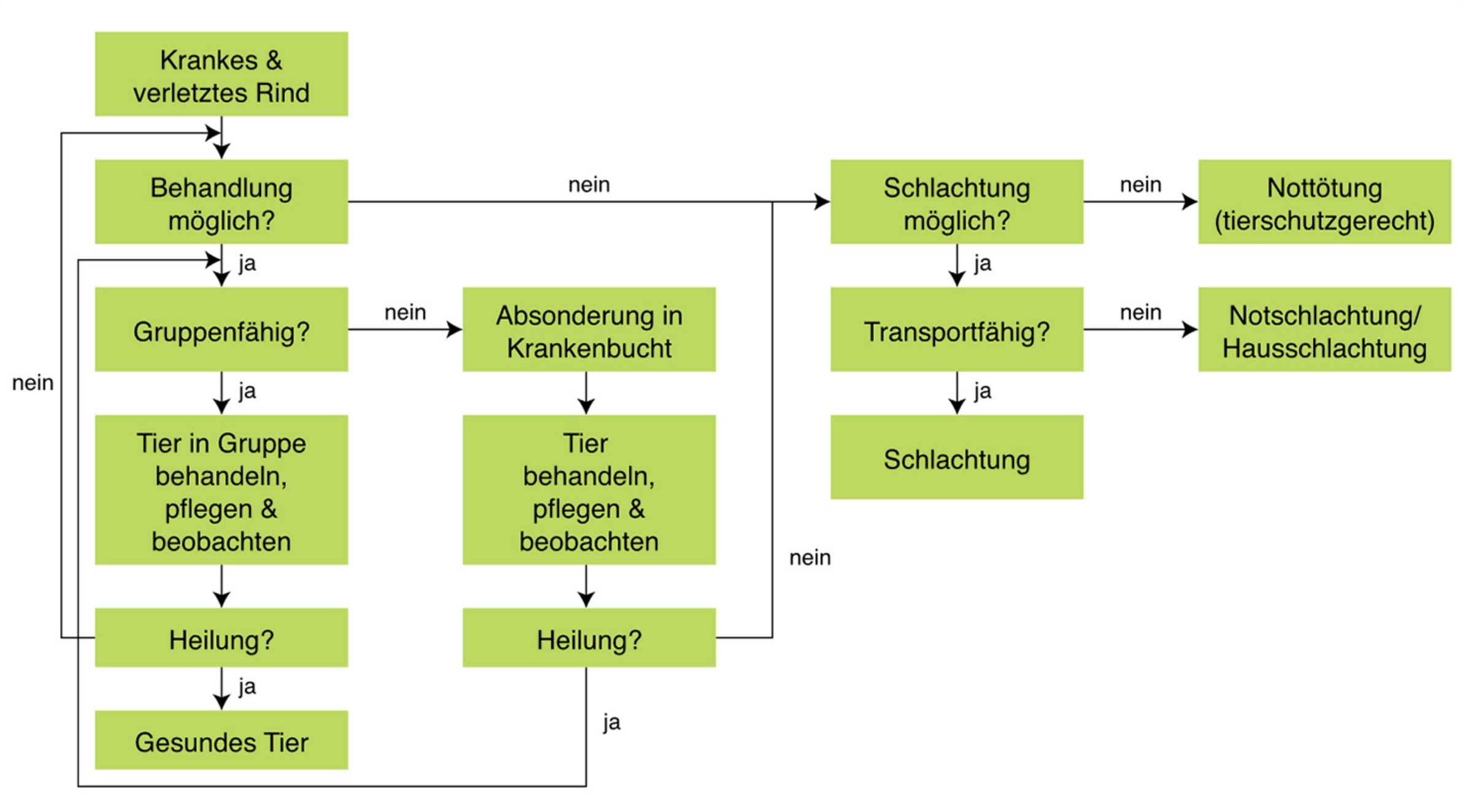 Nach der Identifizierung des kranken Tieres ist der gezielte, der Situation und vor allem dem Zustand des Tieres angepasste Umgang mit diesem wichtig. Nicht immer lässt sich einfach entscheiden, wie mit dem Tier weiter umgegangen werden sollte. Dies beginnt schon bei der Einstufung der Schwere der Erkrankung oder der Verletzung. Sollte der Bestandstierarzt kontaktiert werden? Muss das Tier in eine Genesungsbucht gebracht werden? Wie hoch sind die Chancen für eine schnelle Heilung? Wie ist vorzugehen, wenn die Prognose für den weiteren Krankheitsverlauf sehr ungünstig ausfällt? Kann das Tier zum Schlachthof transportiert werden? Muss das Tier notgetötet werden und in welchen Fällen wäre eine Notschlachtung möglich?