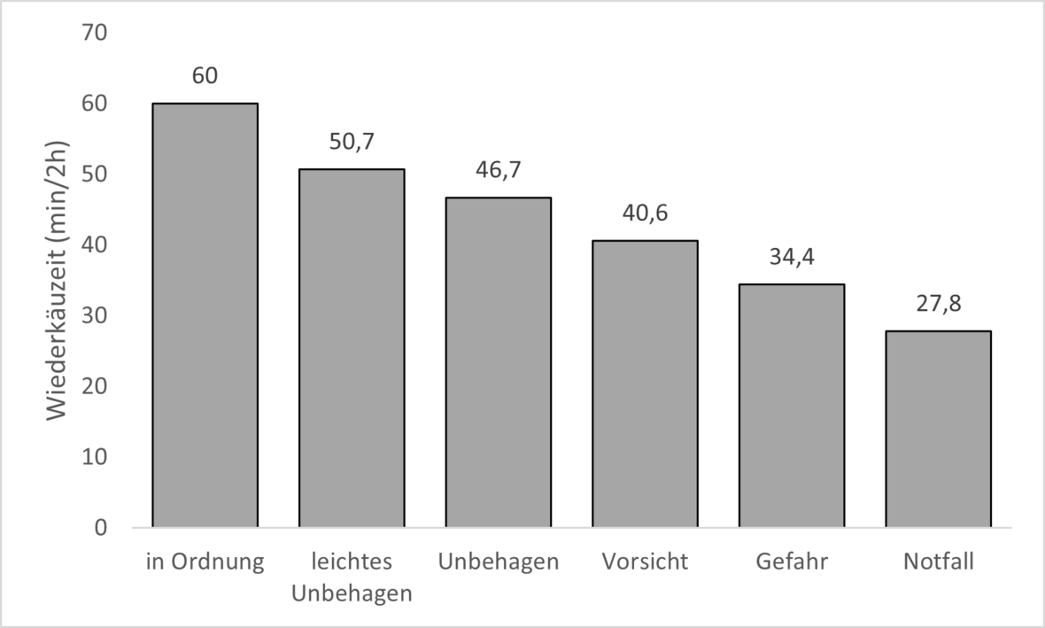 Üblicherweise zeigen Kühe bei Hitzestress eine reduzierte Futteraufnahme und eine geringere Wiederkauzeit. Allerdings kann auch bei Hitzestress die Wiederkäuzeit durch eine vermehrte Speichelbildung (und damit mehr Natrium-Bi-Carbonat [Natriumhydrogencarbonat]) verlängert sein, was z. B. bei Mastrindern beobachtet wurde (Brscic et al., 2021).