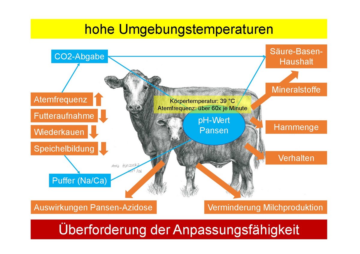 Beide Faktoren können sich unterschiedlich stark auf den Pansen-pH-Wert und den Säure-Basen-Haushalt im Blut auswirken. Eine Verminderung der Futteraufnahme mit einer einhergehenden Verminderung der Aufnahme an Rohfaser senkt die Wiederkautätigkeit und damit die Menge an gebildetem Speichel, der einen Beitrag zur Abpufferung des pH-Wertes im Pansen leistet. Die erhöhte Atemfrequenz führt zu einer Erhöhung der Abgabe von Kohlendioxid, welches neben der Beeinflussung des pH-Wertes im Pansen direkt auf den Säure-Basen-Haushalt der Kühe wirkt. Bei weiter steigenden Körperkerntemperaturen kann eine Veränderung des Haushaltes der Mineralstoffe und eine deutliche Reduzierung der Milchmenge mit einer Reduzierung der Milchinhaltsstoffe beobachtet werden, die sich sowohl auf die Leistung der Kühe als auch die Leistung der Kälber auswirkt und dann auch zu einer Überforderung der Anpassungsfähigkeit führen kann (vergleiche Abbildung).