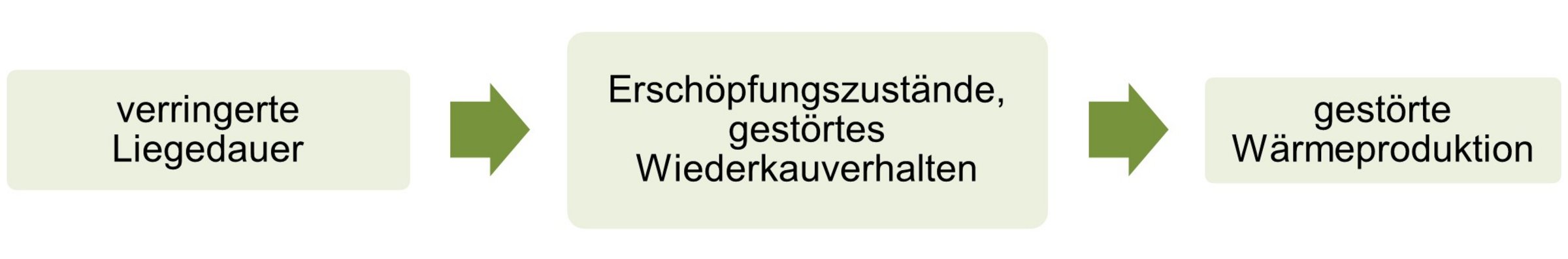 Rinder meiden üblicherweise den direkten Kontakt zum kalten, feuchten Boden, wodurch Körperwärmeverluste eingeschränkt werden können. Unter Umständen tritt diese Verhaltensweise häufiger bei langanhaltendem Regen und tiefen Temperaturen auf und könnte zu Erschöpfungszuständen führen. Da Wiederkauen in Verbindung mit dem Liegeverhalten auftritt, kann bei einem gestörten Liegeverhalten auch das Wiederkauverhalten beeinträchtigt werden. Dies kann die Wärmeerzeugung des Körpers stören.