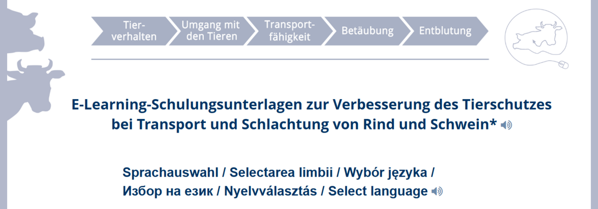 Die Freie Universität Berlin hat im Projekt eSchulTS2 (Entwicklung von zielgruppenorientierten E-Learning-Schulungsunterlagen zur Verbesserung des Tierschutzes bei Transport und Schlachtung von Rind und Schwein, gefördert durch das Bundesministerium für Ernährung und Landwirtschaft) E-Learning-Module zum Tierschutz beim Transport und der Schlachtung von Rindern und Schweinen in verschiedenen Sprachen erstellt. Zielgruppen der Schulungsmaterialen sind Mitarbeitende in Transport- und Schlachtunternehmen, die mit lebenden Tieren umgehen.