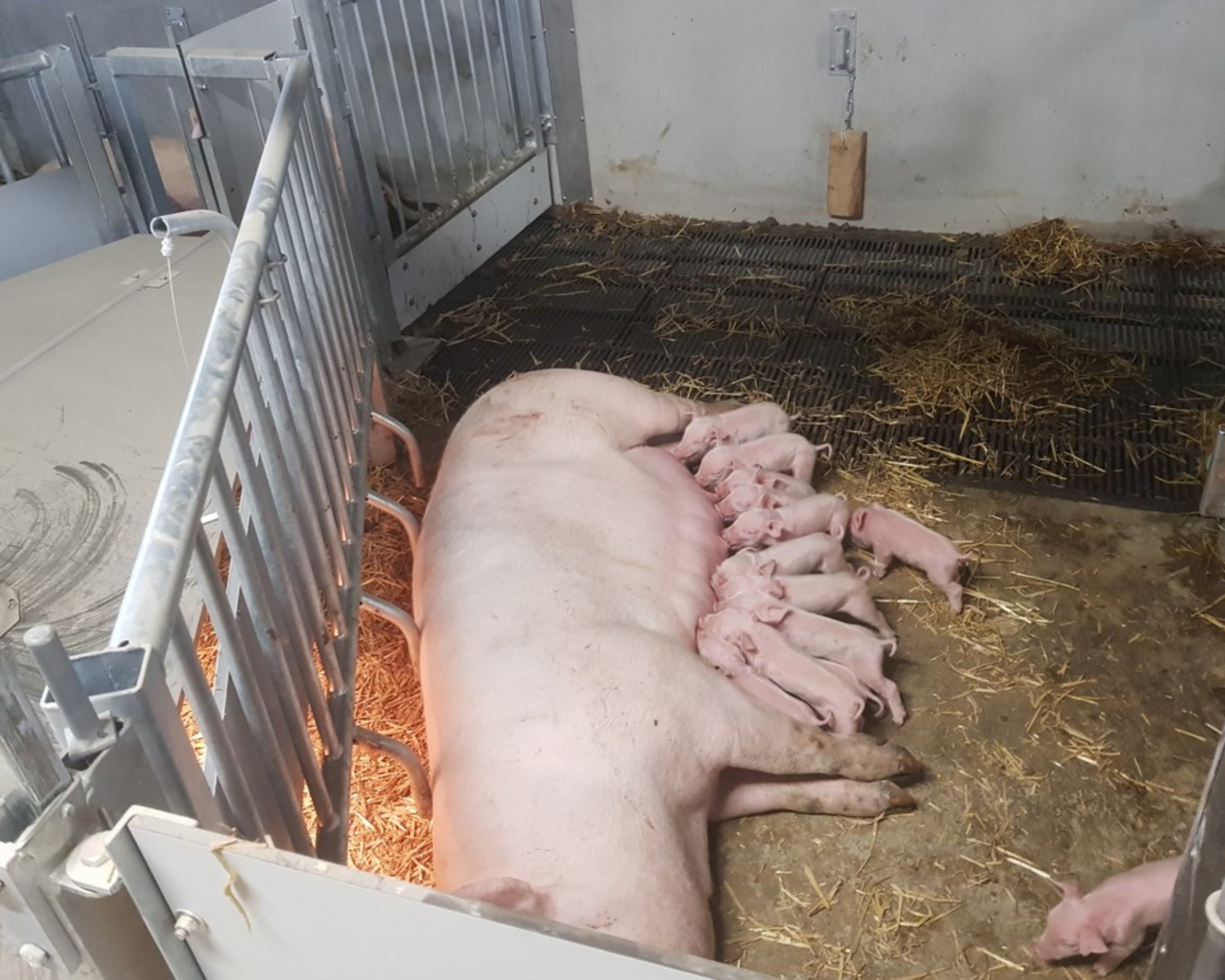 Der Ökohof Liescher, gelegen im Landkreis Rostock, arbeitet seit drei Jahren mit dem System der freien Abferkelung (ein Video zum Betrieb finden Sie hier). Die Zucht auf Mütterlichkeit, gute Fruchtbarkeit und Milchleistung sind für den Betrieb Liescher essentielle Erfolgsparameter für die Umsetzung dieses Haltungskonzepts. Die Säugezeit beträgt hier 42 Tage. Die Jungsauen ferkeln seit der Umstellung auf freie Abferkelung deutlich entspannter ab und kommen ihrem natürlichen Verhalten des Nestbaus nach. Dieses Verhalten wird zusätzlich durch das eingesetzte Stroh gefördert. Aufgrund der Bewegungsfreiheit und der damit verbundenen erhöhten Aktivität der Sau haben sich die Mastitis-Metritis-Agalaktie-Probleme (MMA) für den Betrieb sichtlich verringert. Auch für die Ferkel bringt es einige Vorteile. Sie fangen früher an zu fressen, da die Mutter die Ferkel beim Fressen anlernen kann. Zudem sind sie lauffreudiger als Ferkel von Sauen, die in Ferkelschutzkörben abferkeln. Nachteile dieses Verfahrens sieht der Betrieb Liescher im sehr hohen Strohverbrauch je Sau und Jahr und dem höheren Arbeitsaufwand durch die dreimalige Entmistung pro Woche. Als wichtigen Tipp für Betriebe, die in dieses Haltungsverfahren einsteigen wollen, gibt Frau Liescher mit auf den Weg, dass Jungsauen ausgewählt werden sollten, die sehr zutraulich sind, um aggressives Verhalten der Sau gegenüber dem Betreuer zu vermeiden. Auch das Integrieren von Abliegestangen in der Bucht ist besonders wichtig, um Erdrückungsverluste zu minimieren.