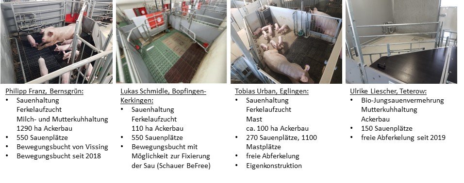 Bevor die Referierenden auf ihre Erfahrungen zu sprechen kamen, stellten sie ihren Betrieb kurz vor. Dabei wurde ersichtlich, dass die Systeme Bewegungsbucht und freie Abferkelung funktionieren und in den verschiedenen Betriebsstrukturen damit gearbeitet wird. Alle vier Landwirte betonten immer wieder, dass das Gelingen der Umstellung nur dann reibungslos funktioniert, wenn das neue System mit einer positiven Grundeinstellung angegangen wird.