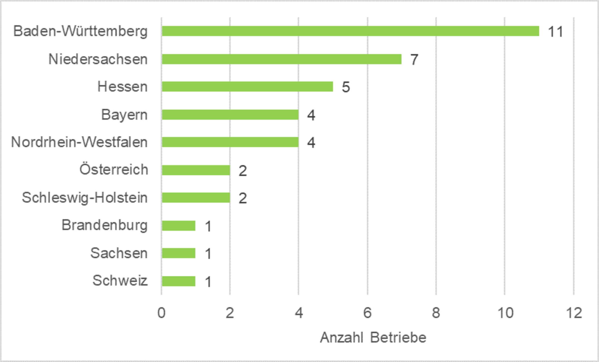 Das Tierwohl-Kompetenzzentrum Schwein des Netzwerks Fokus Tierwohl rief im vergangenen Jahr Sauenhalter auf, ihre Praxiserfahrungen mit Bewegungsbuchten und der freien Abferkelung zu teilen. Die Umfrage, die im Rahmen der Arbeit der AG Saugferkelverluste entstanden ist, bündelt die bisherigen Erfahrungen aus der Praxis. Die Erfahrungen zum Einsatz von Bewegungsbuchten finden Sie hier. An der Umfrage nahmen insgesamt 214 Sauenhalter aus ganz Deutschland, Österreich und der Schweiz teil. Von ihnen gaben 80 Teilnehmer an, mit der freien Abferkelung zu arbeiten. Dabei können 36 Betriebe auf mehr als 5 Jahre Erfahrung zurückgreifen. Weitere 27 Teilnehmer betreiben bereits seit 1 – 5 Jahren die freie Abferkelung. Bezogen auf die Anzahl der Freilaufbuchten im Betrieb gab es, anders als bei den Umfrageteilnehmern mit Bewegungsbuchten, nur 5 Sauenhalter, die bisher nur eine geringe Anzahl von Buchten zum Testen eingebaut haben. Bei 56 Betrieben ermöglichen bereits alle Buchten im Abferkelstall die freie Abferkelung. Die Vermutung, dass es sich bei den Betrieben mit freier Abferkelung vorwiegend um ökologisch wirtschaftende Betriebe handelt, bestätigen die Antworten in der Umfrage nicht. Die Verteilung der ökologisch und konventionell wirtschaftenden Betriebe war ausgeglichen. Ein Blick auf die angegebenen Betriebsgrößen zeigt, dass es sich bei den Teilnehmern vorwiegend um Betriebe mit weniger als 100 Sauen handelt (Abb. 1). Nicht alle Umfrageteilnehmer machten eine Angabe dazu, wo ihr Ferkelerzeugerbetrieb liegt. Abbildung 2 zeigt die Verteilung der Betriebe, die ihren Standort angaben.