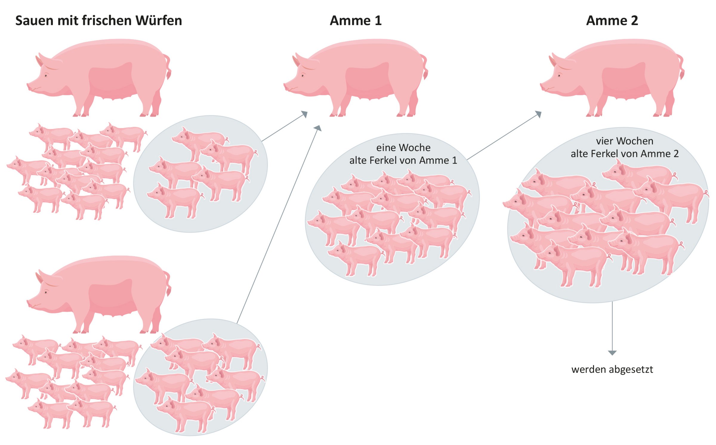 Bei hochfruchtbaren Sauen ist die durchschnittliche Anzahl der Zitzen bei den Sauen regelmäßig kleiner als die Anzahl an lebend geborenen Ferkeln. Meist sind also mehr Ferkel vorhanden als die Sauen säugen können. Die Aufzucht dieser „überzähligen“ Ferkel ist eine Herausforderung, der man sich sowohl aus Sicht des Tierschutzes als auch aus wirtschaftlicher Sicht stellen muss. Hierzu bedient man sich dem Konzept „Ammenaufzucht“, d. h. Ferkel werden nicht von ihrer eigenen Mutter aufgezogen.