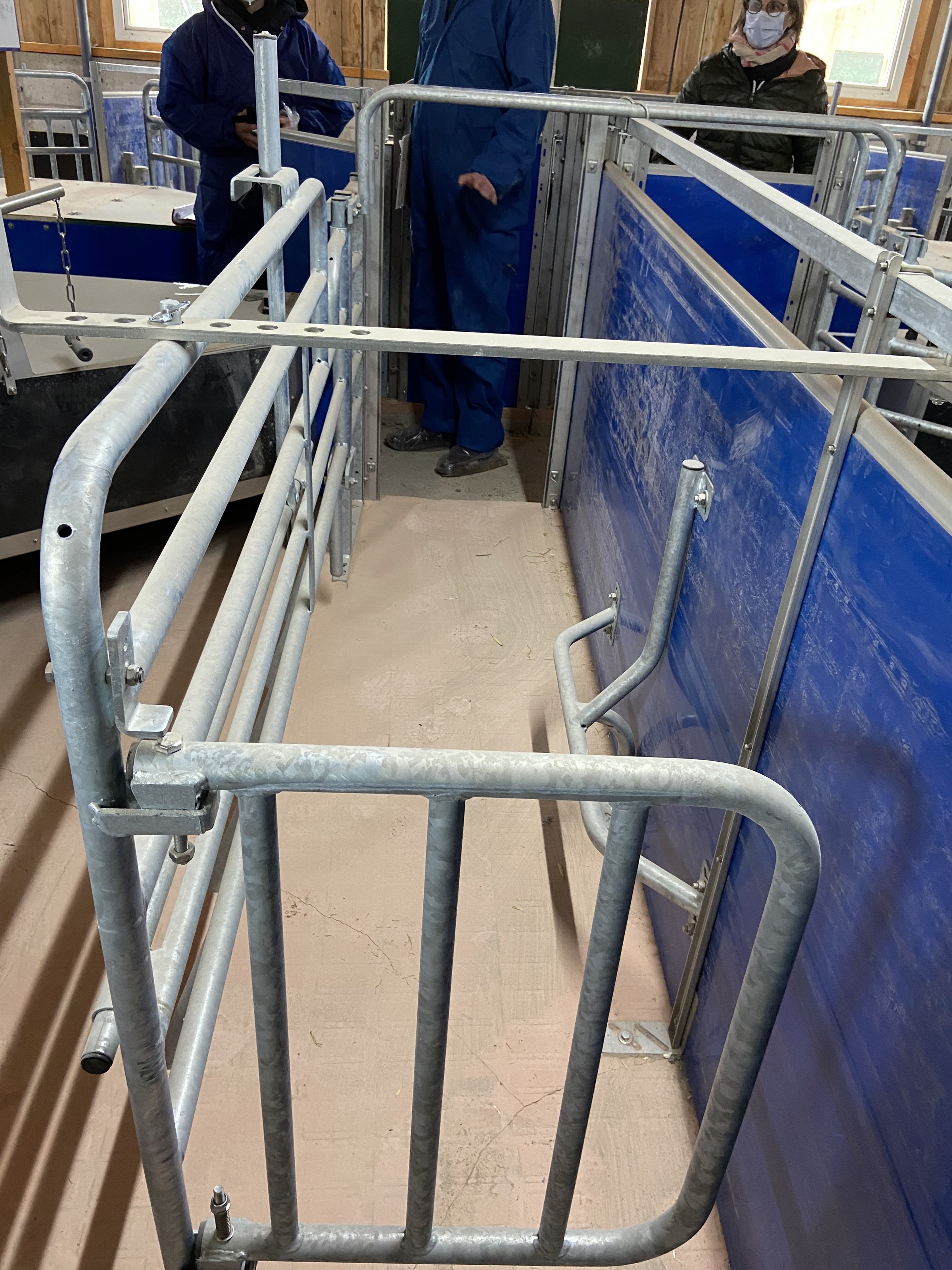 - "Sau sollte zum Impfen oder anderen Tätigkeiten leicht eingesperrt oder mit einem Seitenteil des Ferkelschutzkorbs 'in Schach' gehalten werden können (im Notfall)"