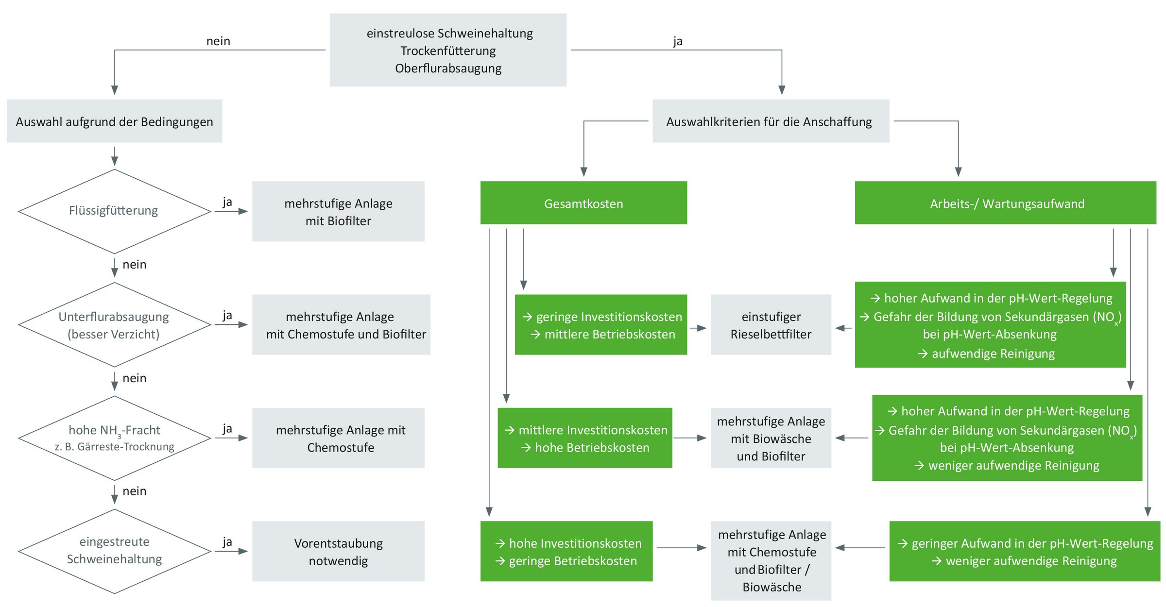 Es muss für jeden Stall individuell entschieden werden, welche ARA verwendet werden soll. Entscheidend ist, dass die ARA für den Einsatzzweck zertifiziert ist. Weitere Kriterien sind z. B. die Leistung der Anlage oder auch die Stalltechnik, wie beispielsweise die Fütterungstechnik oder die Lüftungsanlage. Ist auf einem Betrieb aufgrund seiner genehmigten Anzahl von Tierplätzen eine ARA vorgeschrieben, darf nur dann darauf verzichtet werden, wenn z. B. durch einen Außenklimastall die Luft nicht über die ARA gereinigt werden kann und o. g. Anforderungen an ein qualitätsgesichertes Haltungsverfahren, das dem Tierwohl dient, erfüllt werden.