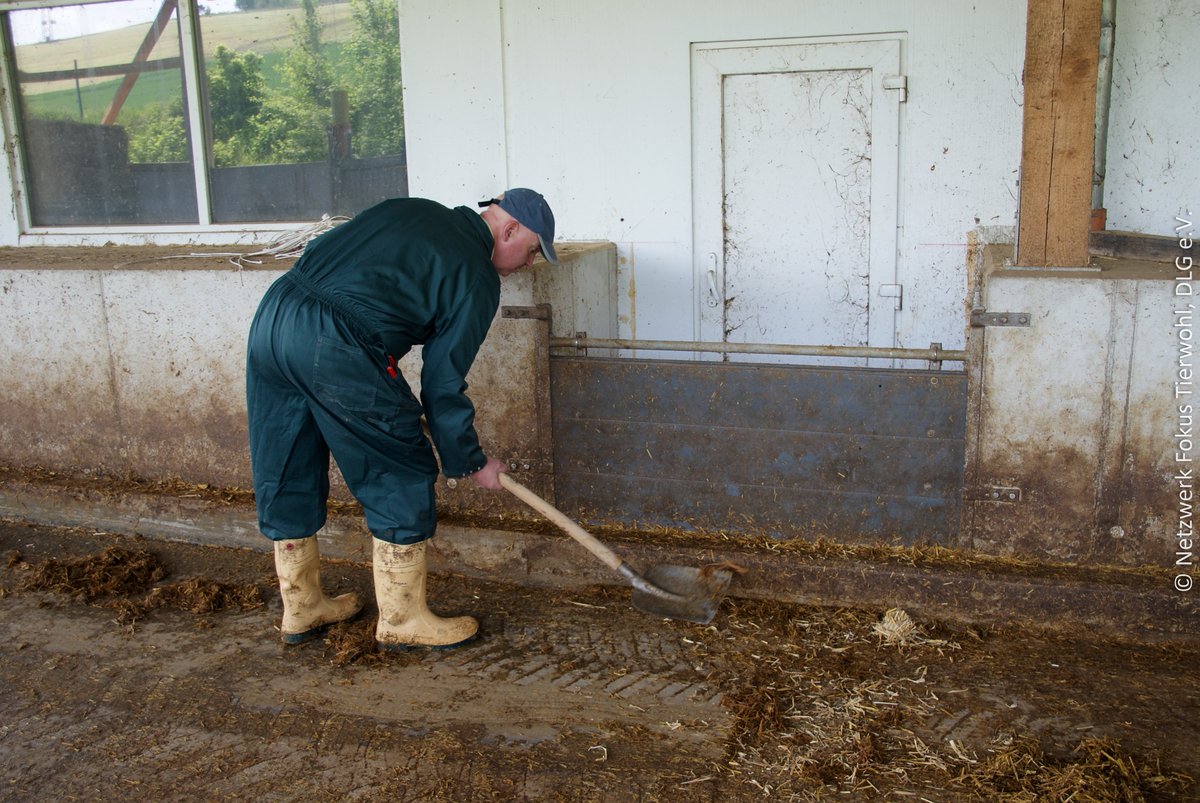 Die Verwendung von Stroh in Ställen als Einstreu dient primär dazu, Kot und Harn zu binden. Zusätzlich kann es als organisches Beschäftigungsmaterial oder weiche Liegefläche verwendet werden. Das verschmutzte Stroh muss wieder aus dem Stall geholt werden. Um dies zeit- und arbeitssparend zu erledigen, sollte der eingestreute Bereich maschinell zu entmisten sein (Abb. 4 & 5). Dies kann mobil mit Schleppern bzw. Radladern oder durch stationäre Entmistungssysteme erfolgen. Auch wenn Handarbeit nicht vollständig entfallen wird (Abb. 6 & 7), kann eine maschinelle Entmistung sehr zur Arbeitserleichterung beitragen. Ist ein Auslauf vorhanden, ist es zeit- und arbeitssparender, wenn die Tiere ausschließlich diesen als Kotbereich nutzen, da er bei guter Bauweise einfacher entmistet werden kann als Mistgänge im Stall.6 Sind die Buchtenabtrennungen aus Gittern, können sich die Tiere sehen und Territorialverhalten tritt auf,7 sodass es neben Kälte, Zugluft und Feuchtigkeit einen weiteren Grund gibt, den Auslauf zum Koten und Harnen zu nutzen. Klappbare Trennwände bzw. Schwenktore zwischen den Buchten und ebenerdige Böden ermöglichen das maschinelle Entmisten aller Ausläufe gleichzeitig. Wesentlich für den Arbeitsaufwand beim Entmisten ist die Funktionalität der Schwenktore und Barrieren. Auch dürfen die Aufhängungen und Verschlüsse der Schwenktore an den Wänden z. B. das maschinelle Entmisten nicht beeinträchtigen.