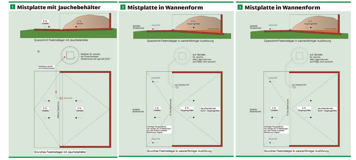 Es gibt drei Varianten von Festmistplatten (Abb. 13) und zusätzlich die Lagerung von Festmist im belegten Stall: