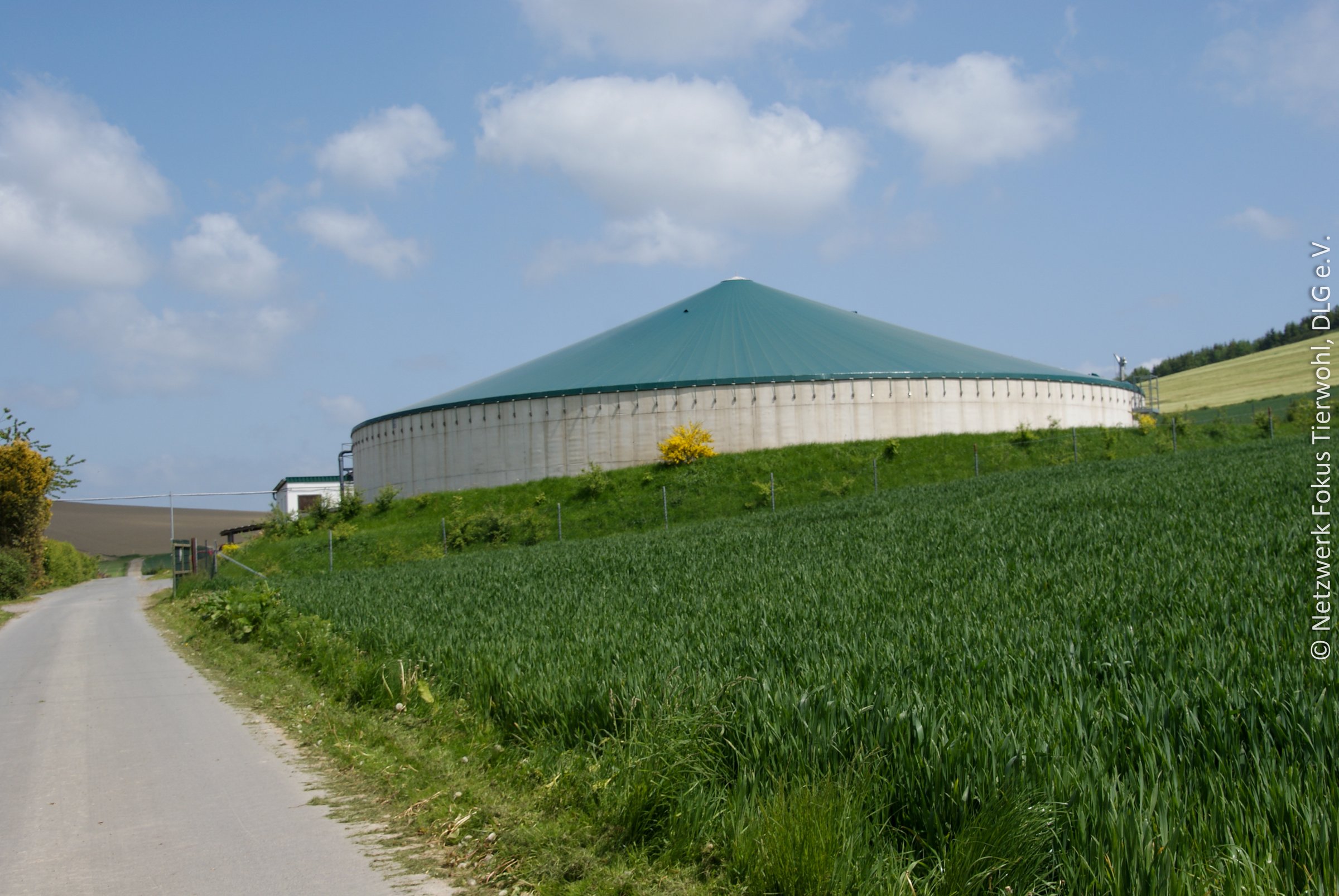 Welche Mistplatte für welchen Betrieb geeignet ist, muss individuell entschieden werden. Es kommt auf die Präferenz der Landwirt:innen, die örtlichen Gegebenheiten und die vorhandene Mechanisierung auf dem Betrieb an.11 Wie auch bei der Lagerung von Heu und Stroh müssen ausreichend Kapazitäten für den Mist vorgehalten werden. Um diesen großen baulichen Aufwand für die mittlerweile allgemein geforderte überdachte Mistplatte zu reduzieren, kann es ein großer Vorteil sein, wenn der anfallende Mist direkt in eine Biogasanlage überführt werden kann (Abbildung 14).
