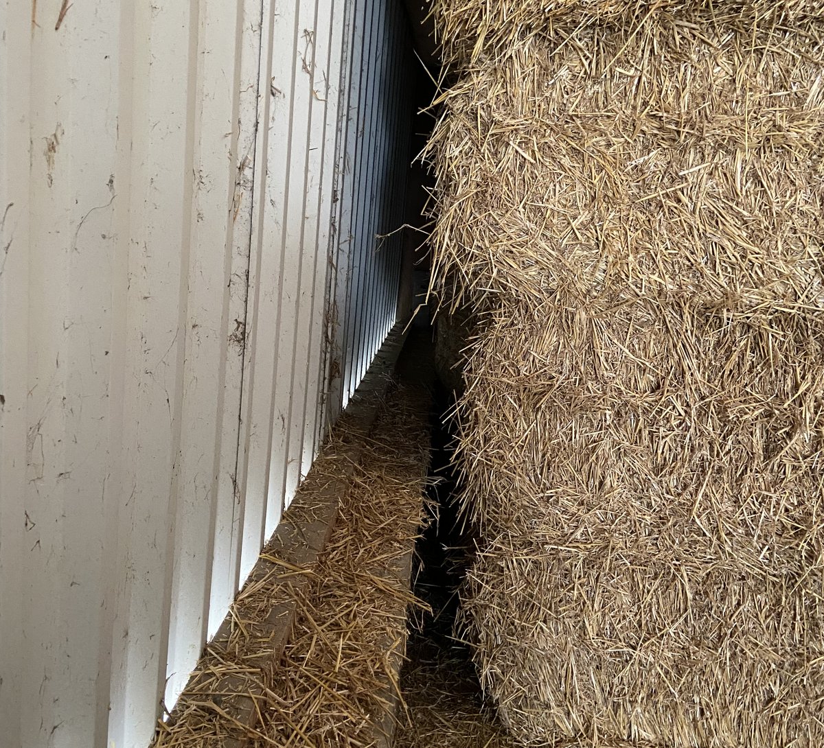 Die Biosicherheit darf bei der Heu- und Strohlagerung nicht vernachlässigt werden. Ist eine Errichtung des Heu-/Strohlagers im nicht eingefriedeten Weißbereich möglich, ist das Fahrzeug, welches die Ballen holt, vor dem Überfahren der Schwarz-Weiß-Grenze zu desinfizieren. Es empfiehlt sich, zumindest für die Übergabe ein Lager mit mehreren Toren zu bauen. Das Material kann dann von der einen Seite angeliefert und von der anderen für die Verwendung herausgenommen werden. Sind mehrere Tore vorhanden, können z. B. verschiedene Futterqualitäten, Heu und Stroh oder auch neue und alte Ballen gesondert gelagert und entnommen werden. Vogelschutznetze sollen Stroh und Heu vor dem Eintrag von Krankheitserregern durch Vögel schützen. Ein Abstand von 10–20 cm zwischen Wand und Ballen dient nicht nur einer ausreichenden Belüftung, sondern auch dem Dezimieren von Schadnagern durch Katzen (Abb. 2).