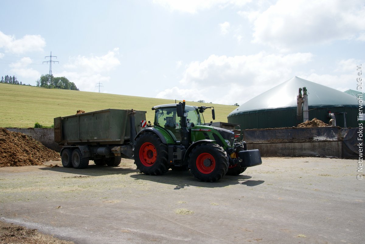 Welche Mistplatte für welchen Betrieb geeignet ist, muss individuell entschieden werden. Es kommt auf die Präferenz der Landwirt:innen, die örtlichen Gegebenheiten und die vorhandene Mechanisierung auf dem Betrieb an.11 Wie auch bei der Lagerung von Heu und Stroh müssen ausreichend Kapazitäten für den Mist vorgehalten werden. Um diesen großen baulichen Aufwand für die mittlerweile allgemein geforderte überdachte Mistplatte zu reduzieren, kann es ein großer Vorteil sein, wenn der anfallende Mist direkt in eine Biogasanlage überführt werden kann (Abbildung 14).